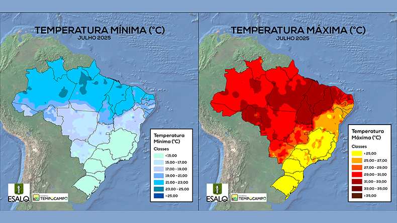 No Norte do país, as temperaturas máximas médias se mantiveram na faixa de 29°C a 31°C, com áreas de Tocantins e Pará chegando a 33°C. No Nordeste, a variação de temperaturas máximas entre os estados foi um pouco maior, com Maranhão e Piauí registrando as maiores temperaturas, de 31°C a 33°C; e Bahia, Pernambuco, Alagoas e Sergipe com máximas de até 27°, com algumas áreas não ultrapassando 25°C. No Centro‑Oeste, predominaram temperaturas máximas entre 27°C e 31°C, enquanto no Sudeste e Sul, a média das temperaturas máximas não ultrapassou 25 °C.