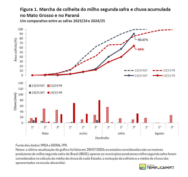 Já no Paraná, a colheita ganhou ritmo apenas na última semana do mês de julho, visto que as operações foram prejudicadas pelas chuvas registradas no final de junho, o que aumentou a umidade das lavouras. Segundo o Departamento de Economia Rural (Deral/PR), as áreas de milho segunda safra apresenta boas condições em sua maioria, com exceção das regiões de Umuarama e Cornélio Procópio, no noroeste e norte do estado, respectivamente.