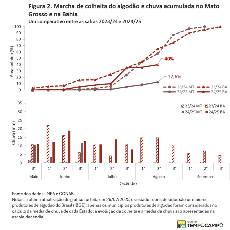 Na Bahia, segundo a Associação de Agricultores e Irrigantes da Bahia (AIBA), a colheita avança conforme a maturação das lavouras, com qualidade satisfatória da pluma, alcançando 40% de progresso nas operações de campo (Figura 2). No Mato Grosso do Sul, as condições climáticas seguem favoráveis ao avanço da colheita, com a aplicação de desfolhantes em áreas de algodão safrinha. Em Minas Gerais, a colheita avança gradualmente e já atinge aproximadamente 50% das áreas cultivadas. No estado de Goiás, especialmente na porção extremo sul, a colheita prossegue nas lavouras de sequeiro, com variação na qualidade da pluma de boa a regular, em função das chuvas tardias ocorridas ao longo do mês.
