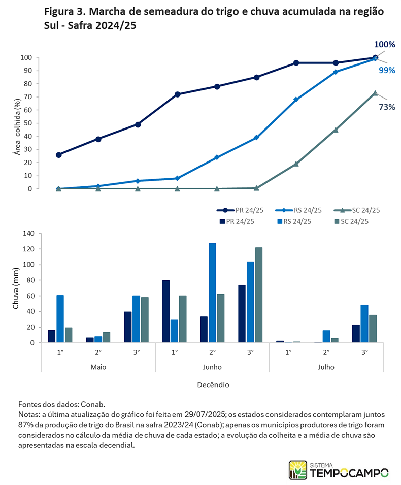 Em São Paulo, a ocorrência de geadas no final de junho e início de julho comprometeu parte das lavouras em fase de enchimento de grãos. Em Minas Gerais, a colheita apresentou atraso devido a um veranico, embora os resultados tenham sido positivos nas regiões do Triângulo Mineiro e Alto Paranaíba. Já no Mato Grosso do Sul, também foram registrados danos em lavouras de trigo em decorrência da ocorrência de geadas.